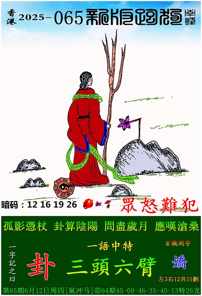 065期新版跑狗一字記之曰:【卦】 玄機測字:《嬌》 一語中特:三頭六臂
