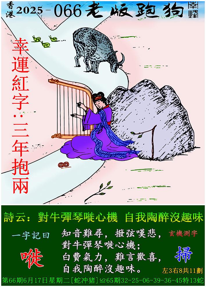 066期老版跑狗一字記之曰:【嘥】 詩雲:對牛彈琴嘥心機,自我陶醉沒趣味。