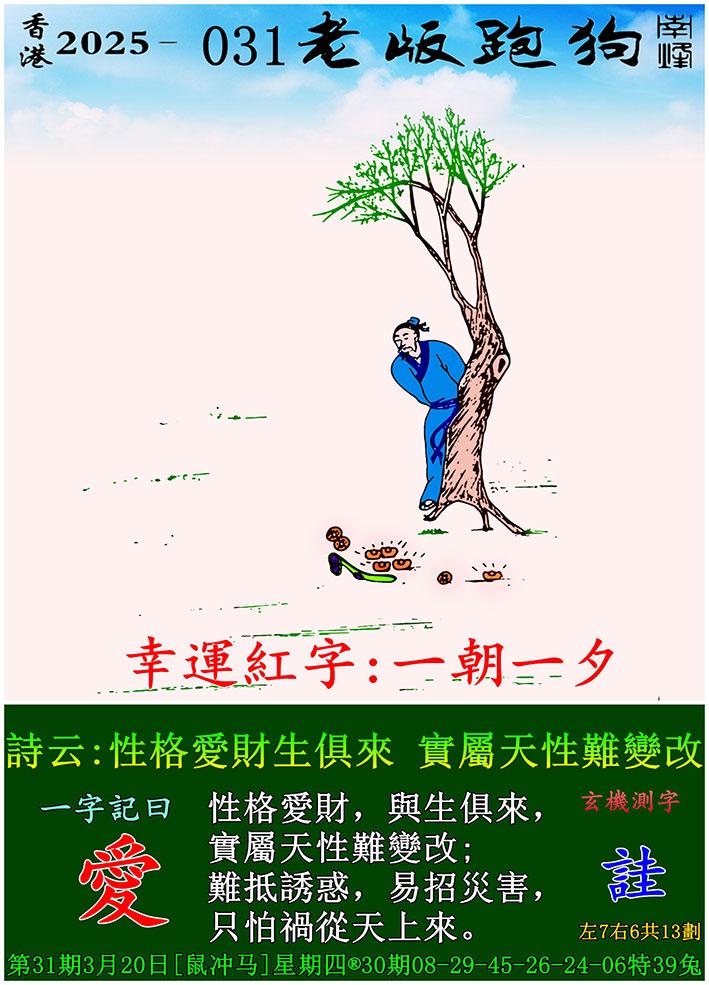 031期老版跑狗一字記之曰:【愛】 詩雲:性格愛財生俱來,實屬天性難變改