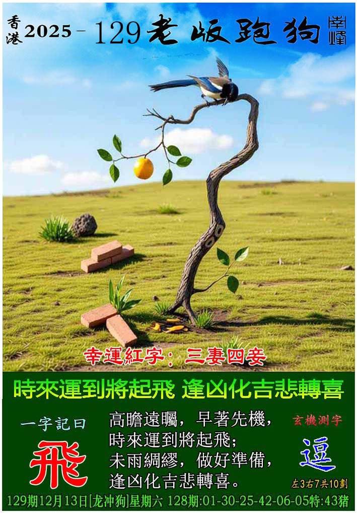 129期老版跑狗一字記之曰:【飛】 詩雲:時來運到將起飛,逢凶化吉悲轉喜。