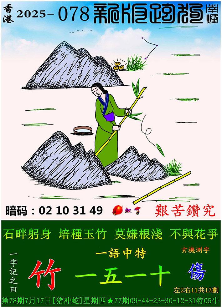 078期新版跑狗一字記之曰:【竹】 玄機測字:《傷》 一語中特:一五一十