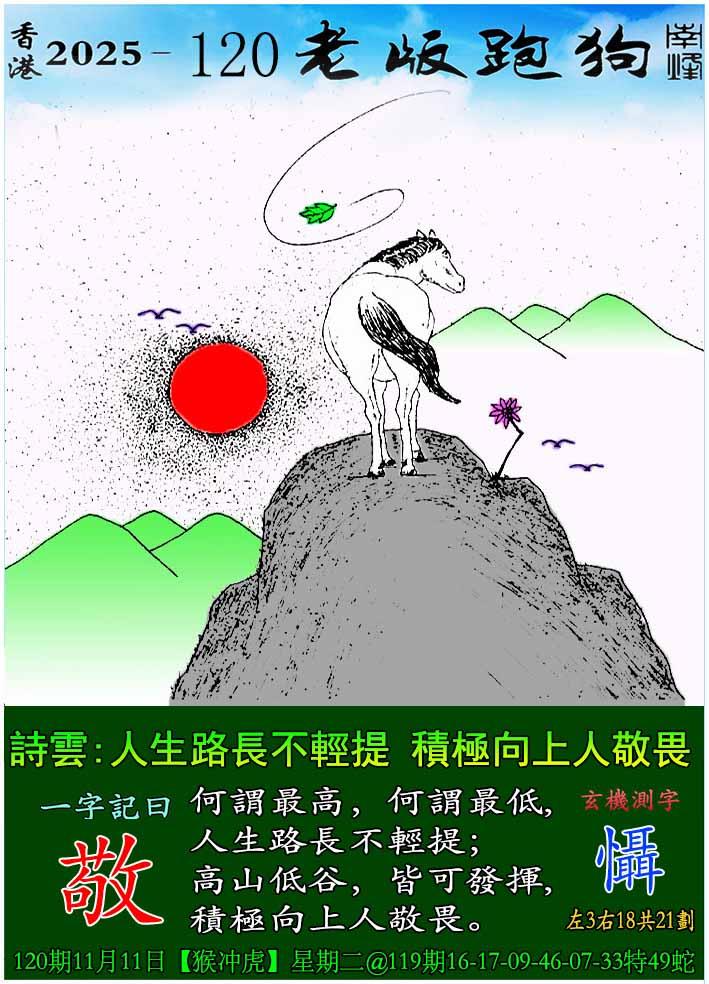 120期老版跑狗一字記之曰:【敬】 詩雲:人生路長不輕提,積極向上人敬畏。