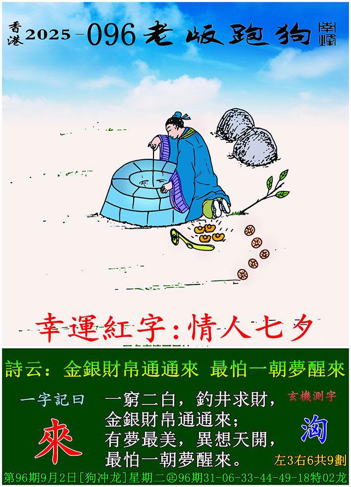096期老版跑狗一字記之曰:【來】 詩雲:金銀財帛通通來,最怕一朝夢醒來。