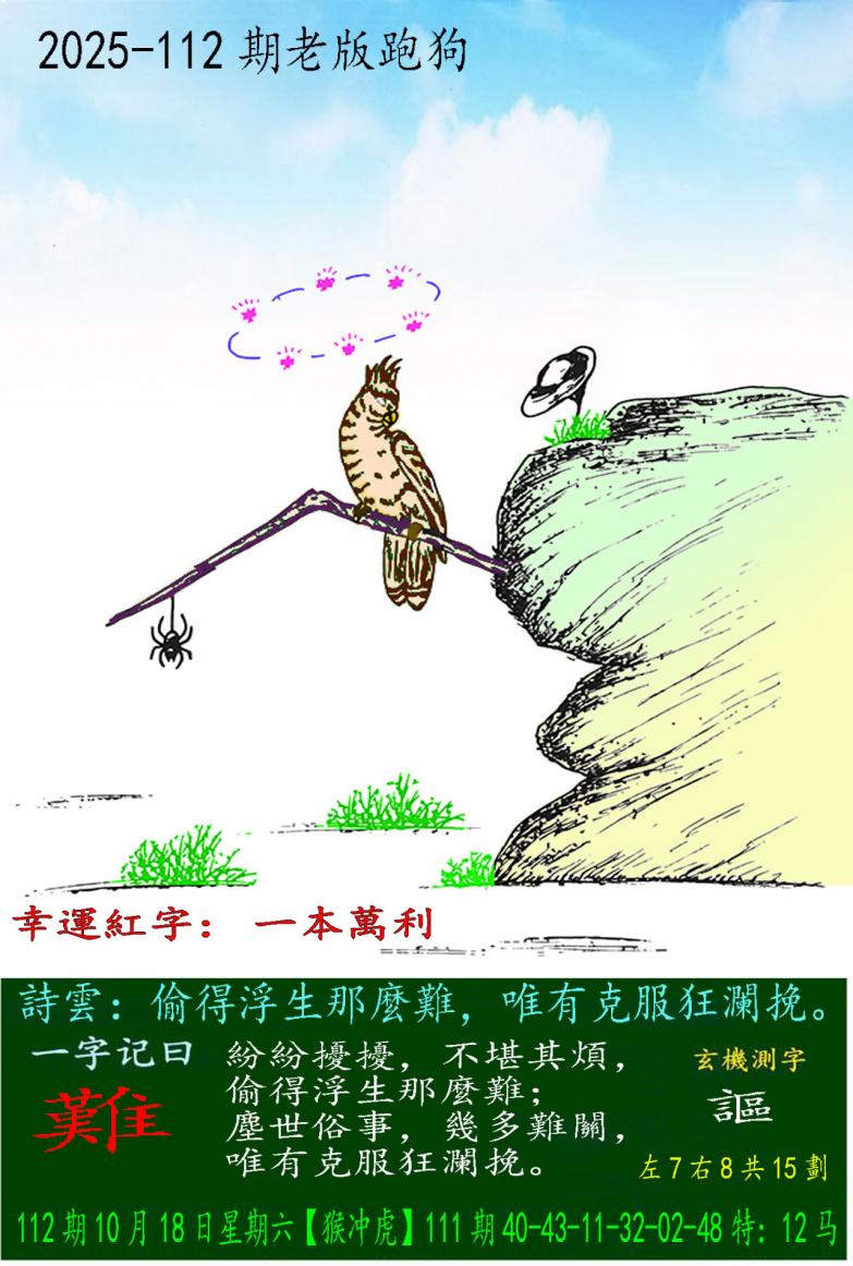 112期老版跑狗一字記之曰:【難】 詩雲:偷得浮生那麼難,唯有克服狂瀾挽。