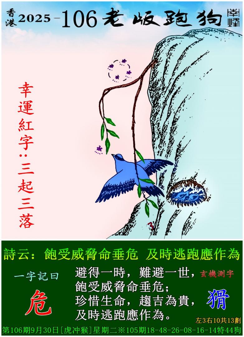 106期老版跑狗一字記之曰:【危】 詩雲:飽受威脅命垂危,及時逃跑應作為。