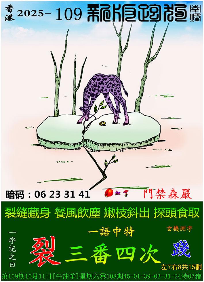 109期新版跑狗一字記之曰:【裂】 玄機測字:《踐》 一語中特:三番四次