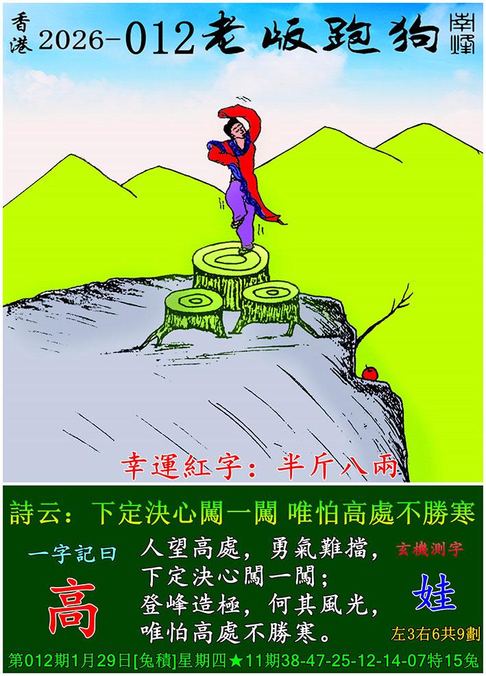 012期老版跑狗一字記之曰:【高】 詩雲:下定決心闖一闖,唯怕高處不勝寒。